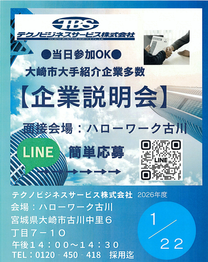 2026年1月22日(木)、テクノビジネスサービス株式会社主催による派遣説明会を開催いたしました。会場はハローワーク古川三階大会議室。派遣就業に関心をお持ちの求職者の皆さまにご参加いただき、就業に向けた具体的な一歩を踏み出す機会となりました。